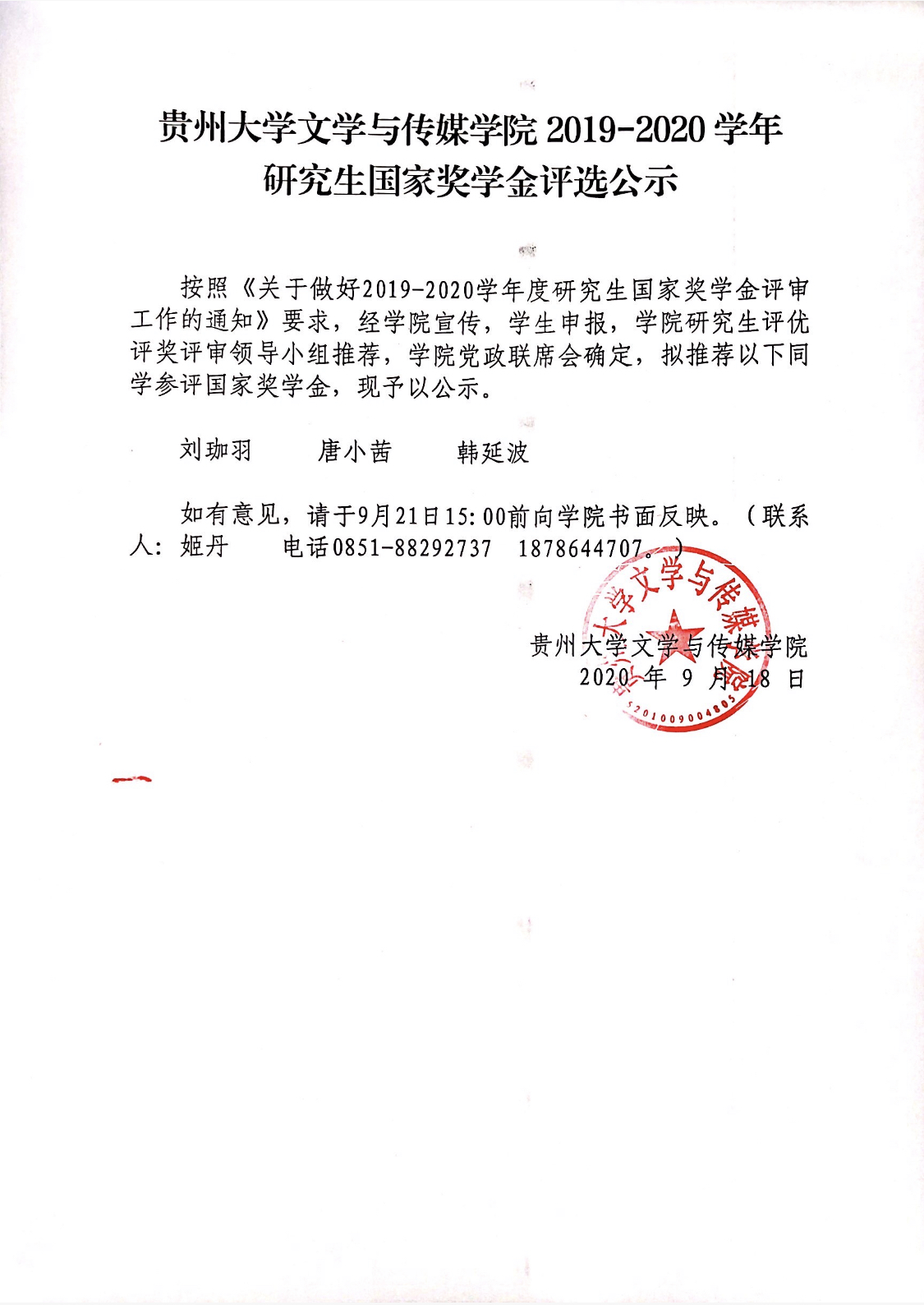 贵州大学文学与传媒学院2019-2020学年研究生国家奖学金评选公示