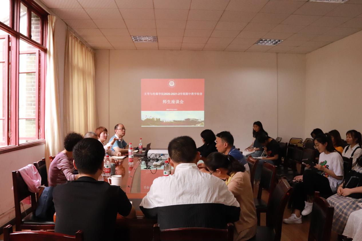 (文学与传媒学院袁小宇报道|摄影毛杭)5月13日下午,文学与传媒学院于东校区人文楼204会议室召开期中教学检查师生座谈会。学校督查组贺杏兰老师,学院党委书记李开学、院长谭德兴、教学科科长郭付利、中文系副主任吕维老师,院督导团吴妍和李青老师以及各班学生代表参加会议。学院副院长唐娟主持会议。