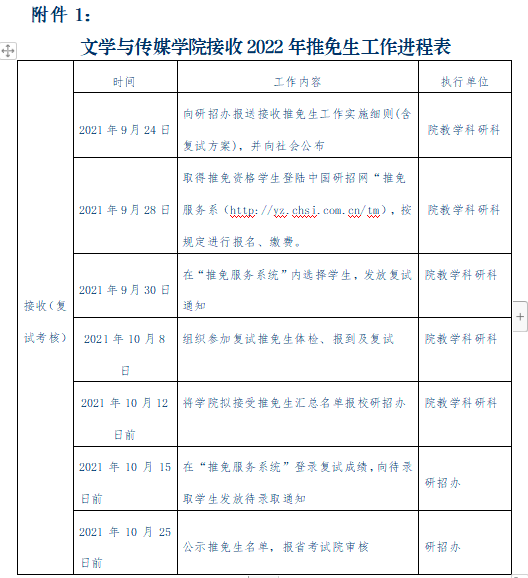 附件1:文学与传媒学院接收2022年推免生工作进程表