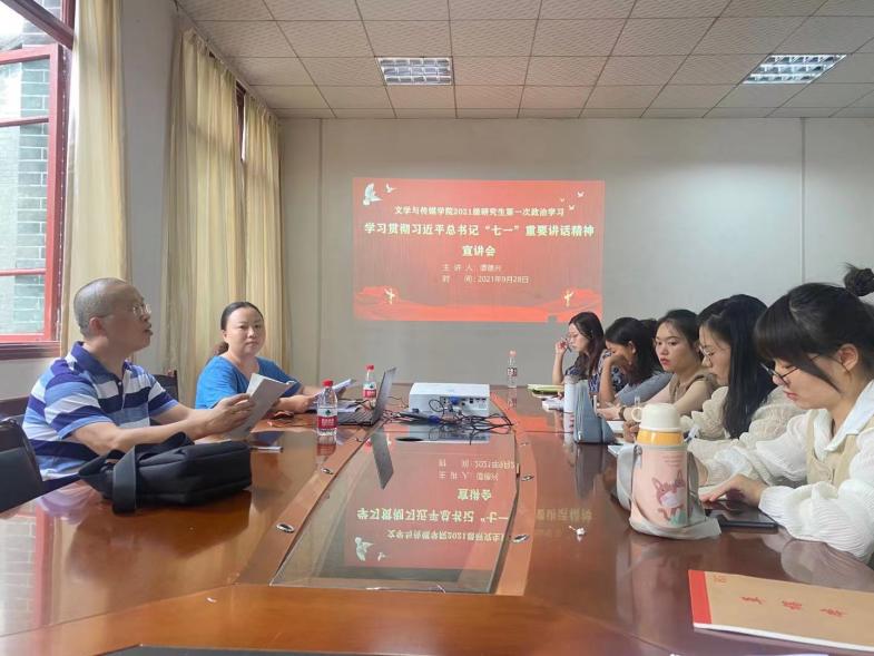 为深入学习习近平总书记在庆祝中国共产党成立100周年大会上的重要讲话精神,提高研究生思想政治水平,文学与传媒学院于9月28日下午在人文楼204会议室开展宣讲,集中学习习近平总书记在庆祝中国共产党成立100周年大会上的重要讲话精神。本次宣讲由文学与传媒学院院长谭德兴主讲,由研究生辅导员姬丹主持,2021级全体研究生参加。