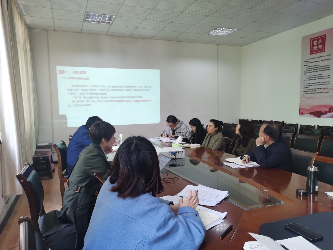 王婷婷对《文学与传媒学院学生疫情防控工作预案》进行介绍。她提出,学生科和各班班主任要对请假销假流程严格把关,坚持“非必要不出校”的原则,明确学生请假事由,督促学生在易班APP上提供全面的请假证明材料并按时销假,重点关注校内学生不假外出的情况。省外学生返校要提供贵州健康码、行程码,严格执行“五天三检”政策并提交核酸检测报告,处于中高风险地区的学生需暂缓返校。