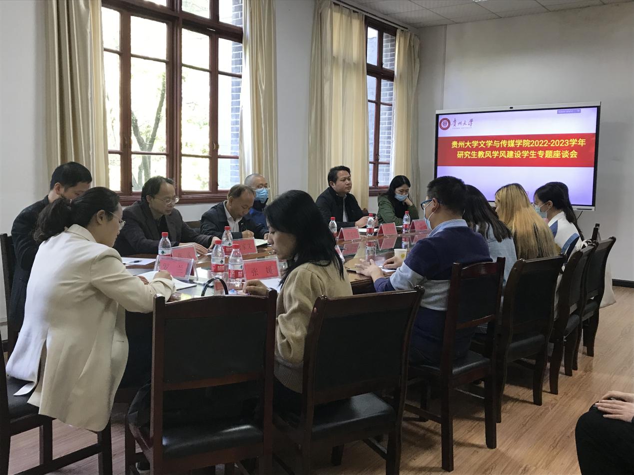 2022年11月2日,贵州大学文学与传媒学院在人文楼204会议室召开研究生教风学风建设学生专题座谈会。学院党委书记李开学、院长谭德兴、副院长赵永刚、学科点负责人魏家文、明茂修、张媛、张波、丁筑兰等老师,研究生辅导员罗兰以及2020级、2021级、2022级学生代表参加本次座谈会,会议由学院副院长赵永刚主持。